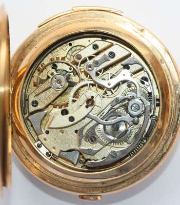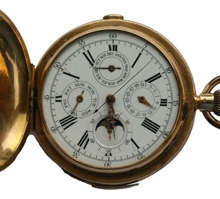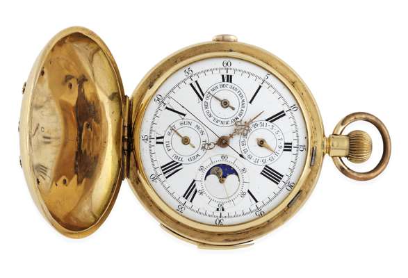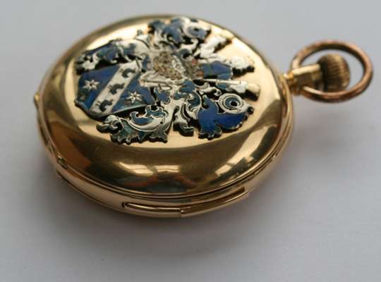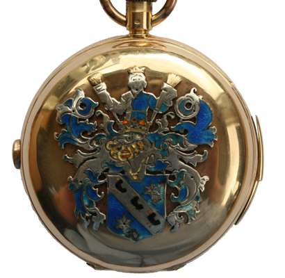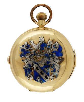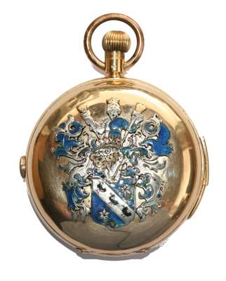 keyless wind with full hunter cases, the outer case (marked 18K) with applied enamelled armorials, the white dial with sweep second hand, Roman numerals, Month, Day, Date, subsidiary seconds dial, moonphase aperture, striking on a gong, quarter repeat mechanism