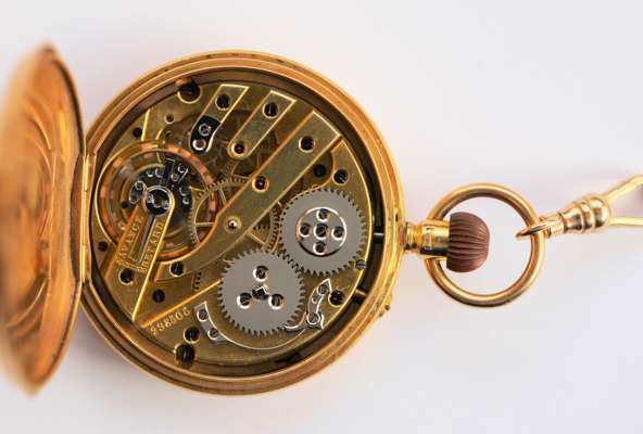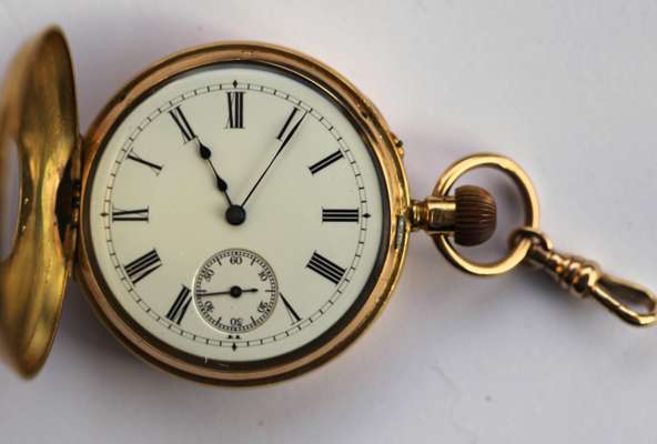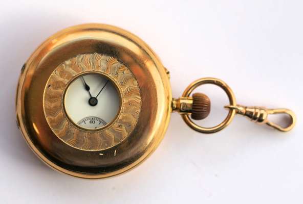 plain enamel dial, Roman numerals, keyless wind, engraved monogram to rear cover, open lever movement