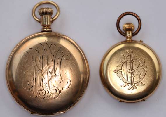 the case with engraved monogram, enamel dial with Roman numerals, movement inscribed R Stewart Buchanan Street Glasgow, together with a Waltham rolled gold hunter cased pocket watch (2)
