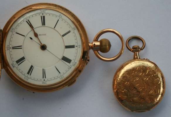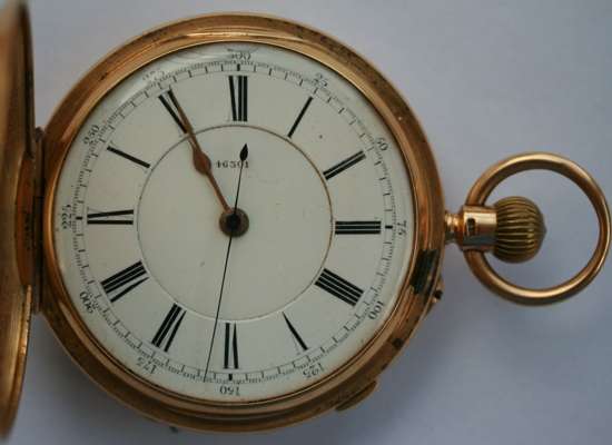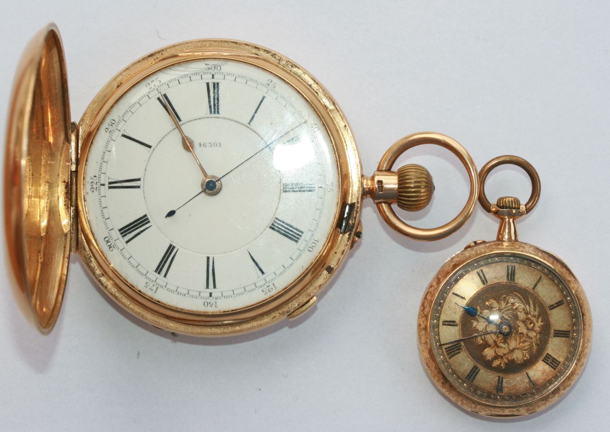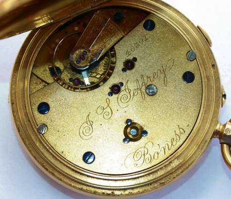 keyless wind with plain case of good gauge, the stepped enamelled dial with sweep second hand, outer fine split seconds indicators, hour Roman numerals, blued hands, numbered to the dial 46301, the three quarter plate lever movement inscribed J S Jeffrey Bo'ness and numbered 49301, side stop start slide, together with a small gold fob watch