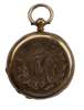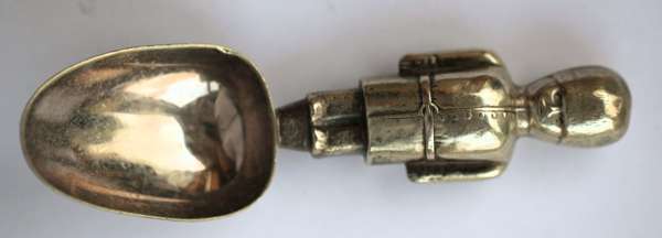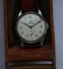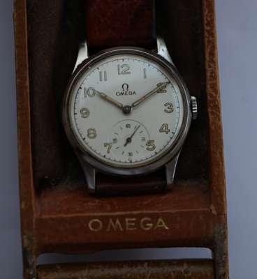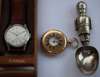 keyless wind with an enamel outer cover, white enamel dial with Roman numerals, engraved monogram to the rear, the movement inscribed Stauffer De Fonds; a mid 20th century chrome cased gentlemans wrist watch, off white dial, inscribed Omega, subsidiary seconds dial, Arabic numerals and in a period Omega case; together with a white metal novelty spoon, the handle as a Guard's officeer with a busby, indistinctly marked