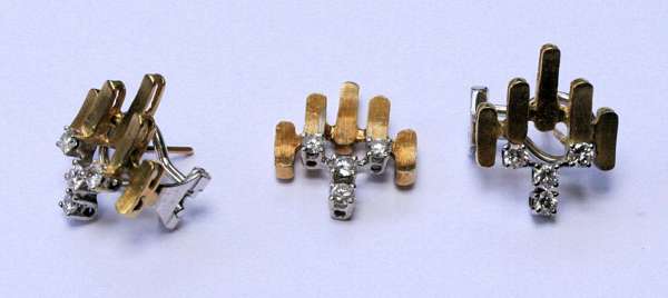 comprising a pendant and a pair of earrings, each claw set with four round brilliant cut diamonds surmounting an undulating border composed of curved satin-finished oval links, setting stamped 750