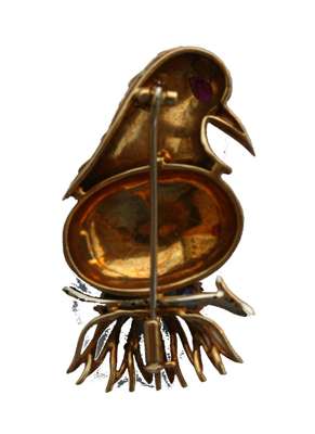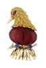 designed as a stylised bird on a branch, the textured head with pear cut ruby set eye, above the red guilloche enamelled oval body, with oval cut sapphire set feet resting upon a branch set with single cut diamonds, surmounting a pierced stylised foliate border, stamped 750