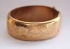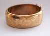 of broad hinged design, the front foliate scroll engraved, with concealed clasp and safety chain