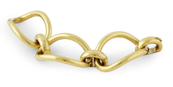 composed of three large shaped oval links, conjoined by smaller oval belcher form links, with concealed hinged clasp and additional safety clip stamped with continental gold control marks, also stamped MOD. DEP. 750