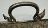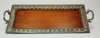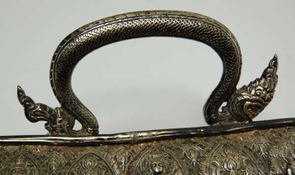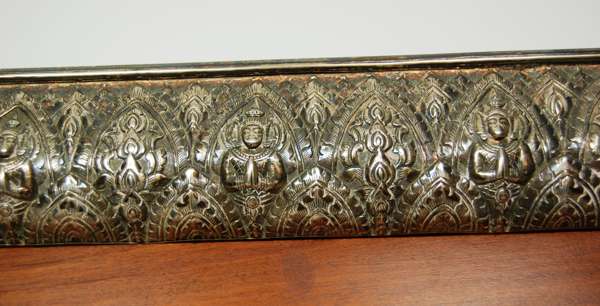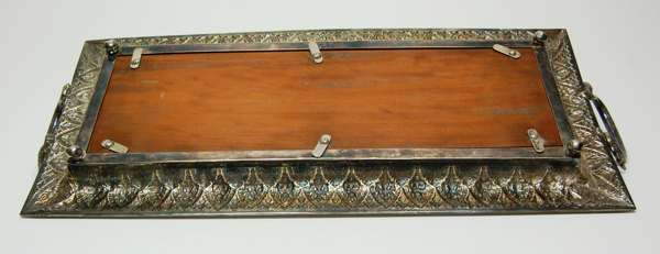 of rectangular outline, the central wooden base framed in a white metal surround with lobed sections decorated with typical Indian embossed decoration, with twin dragon formed loop handles