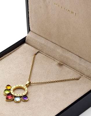 the circular disc with engraved Bulgari deatil holding six moveable gold set cabochon gems; citrine, peridot, pink tourmaline, blue topaz and an amethyst, all on a heavy 18ct gold Bulgari chain and in a Bulgari presentation box