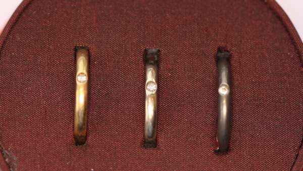 to include a plain yellow gold band set with a single brilliant cut diamond, marks indistinct, together with two similar examples in white gold and titanium, in a fitted case (3)