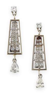 each claw set with a round brilliant cut diamond, surmounting a tapering panel, pave set with graduated single and round brilliant cut diamonds, surmounting a claw set pear cut diamond drop, with post and circular fittings