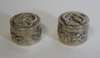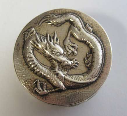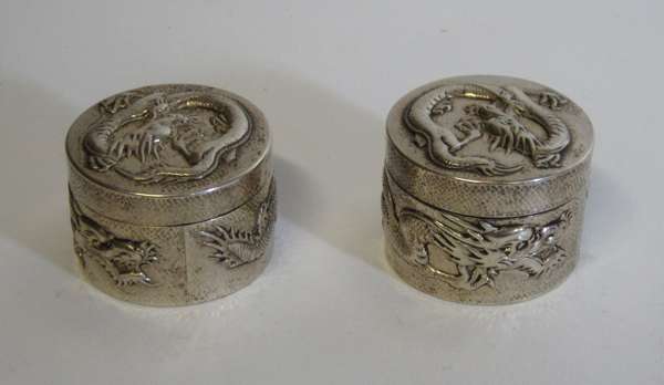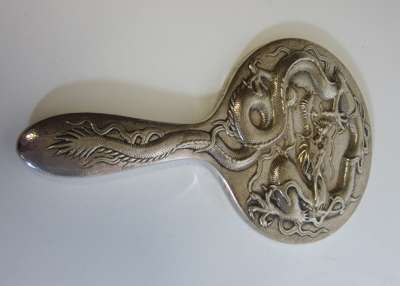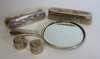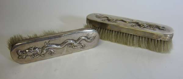 marked WH, 90, character mark, comprising hand mirror, two clothes brushes and two small covered boxes, each decorated with a running dragon and a planished surface (5)
