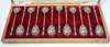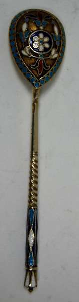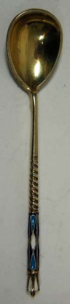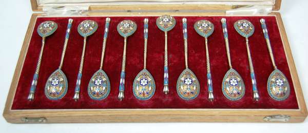 Moscow 1899-1908, possibly Vasily Agafonov, the twelve spoons with gilt bowls, enamel backs and stems, white enamel finials, all in a fitted satin and velvet lined oak case