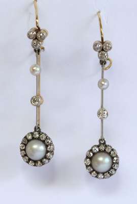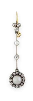 the three diamond terminal with a bar drop set pearl and a diamond mid way, with a circular pendant set central pearl and a diamond set border, pierced gallery, wire fittings