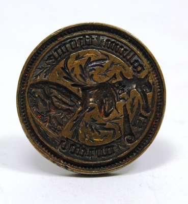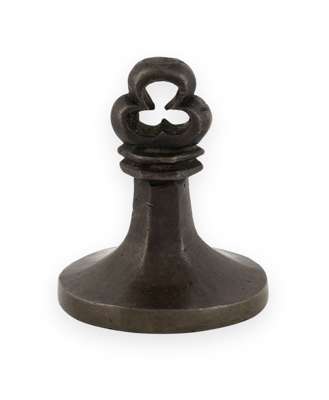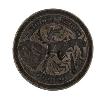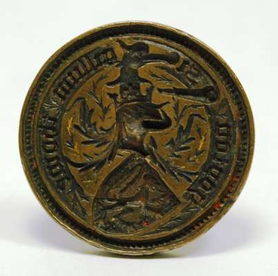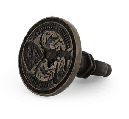 possibly 17th century or earlier, the facetted stem with trefoil loop terminal, the circular matrix with intaglio armorial and motto