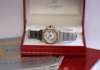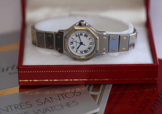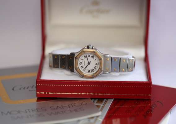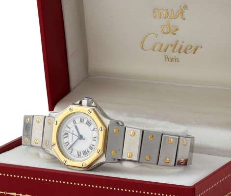 Santos model, circa 1984, gold screwed down bezel frame on a stainless steel case, bracelet with goldscrew detail, winder with sapphire cabochon, imcluding case and papers