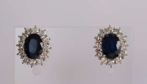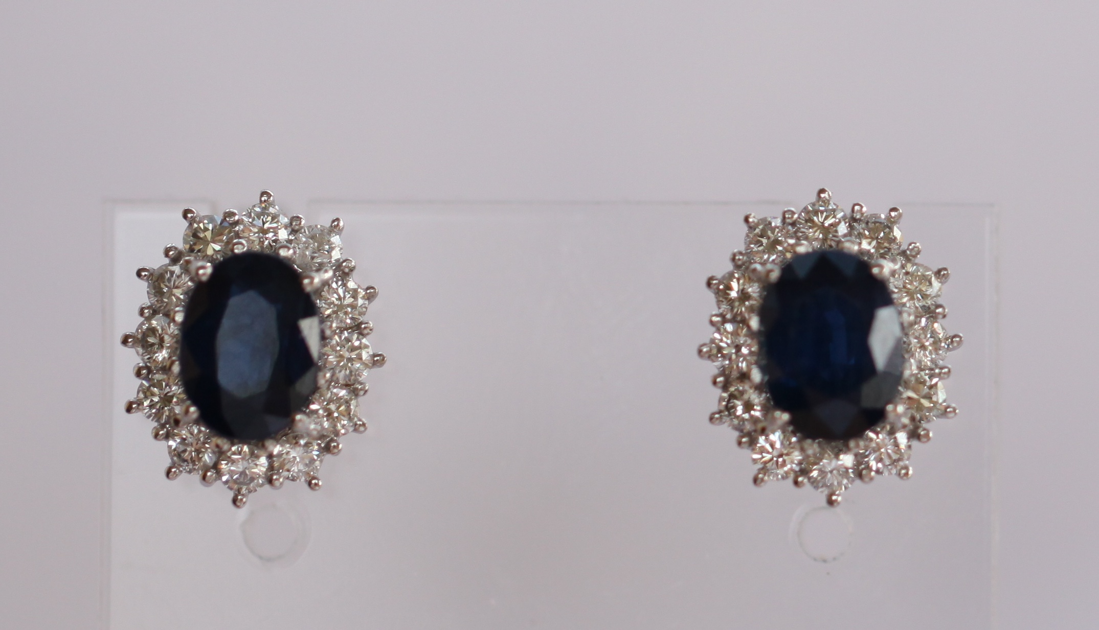 each designed as an oval cluster, with central claw set oval cut sapphire, within a border of round brilliant cut diamonds, with post and butterfly fittings, estimated weights: sapphires 3.98cts total, diamonds estimated to weigh 1.20cts total.