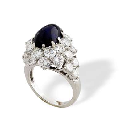 the domed front claw set to the centre with an oval cut sapphire cabochon within two petal shaped borders similarly set with graduated round brilliant cut diamonds, additionally set to each shoulder with a cluster of three similarly cut diamonds, shank numbered 25392