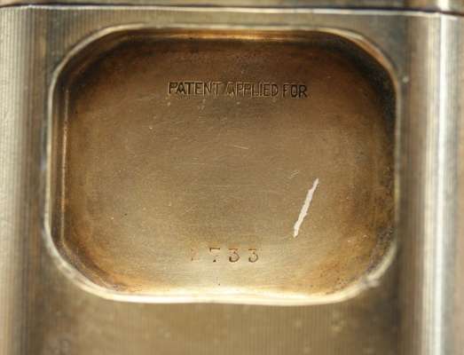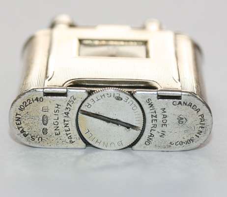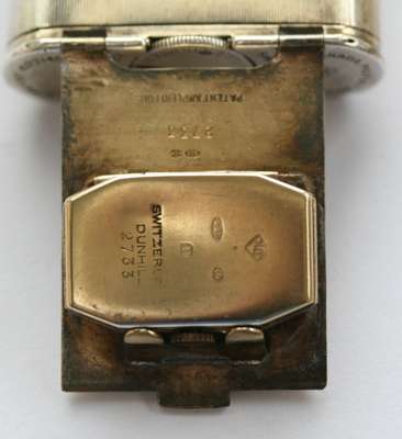 import marks for London 1929, the case with rounded ends, engine turned decoration, rectangular dial with Arabic numerals, gilt hands, inscribed various patent numbers to the base, and 'Dunhill Unique Lighter'
