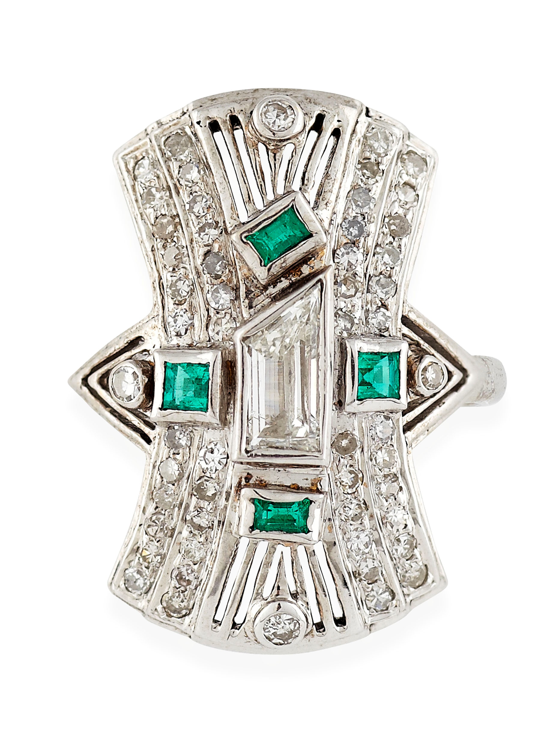 the front of waisted design, with central collet set shaped rectangular cut diamond, the pierced surround similarly set with trap cut emeralds and borders of single cut diamonds, with pierced triangular shoulders, each collet set with a similarly cut diamond