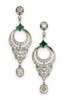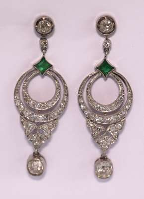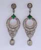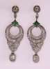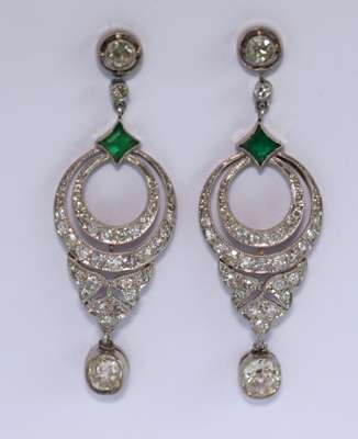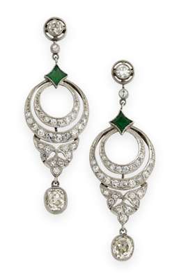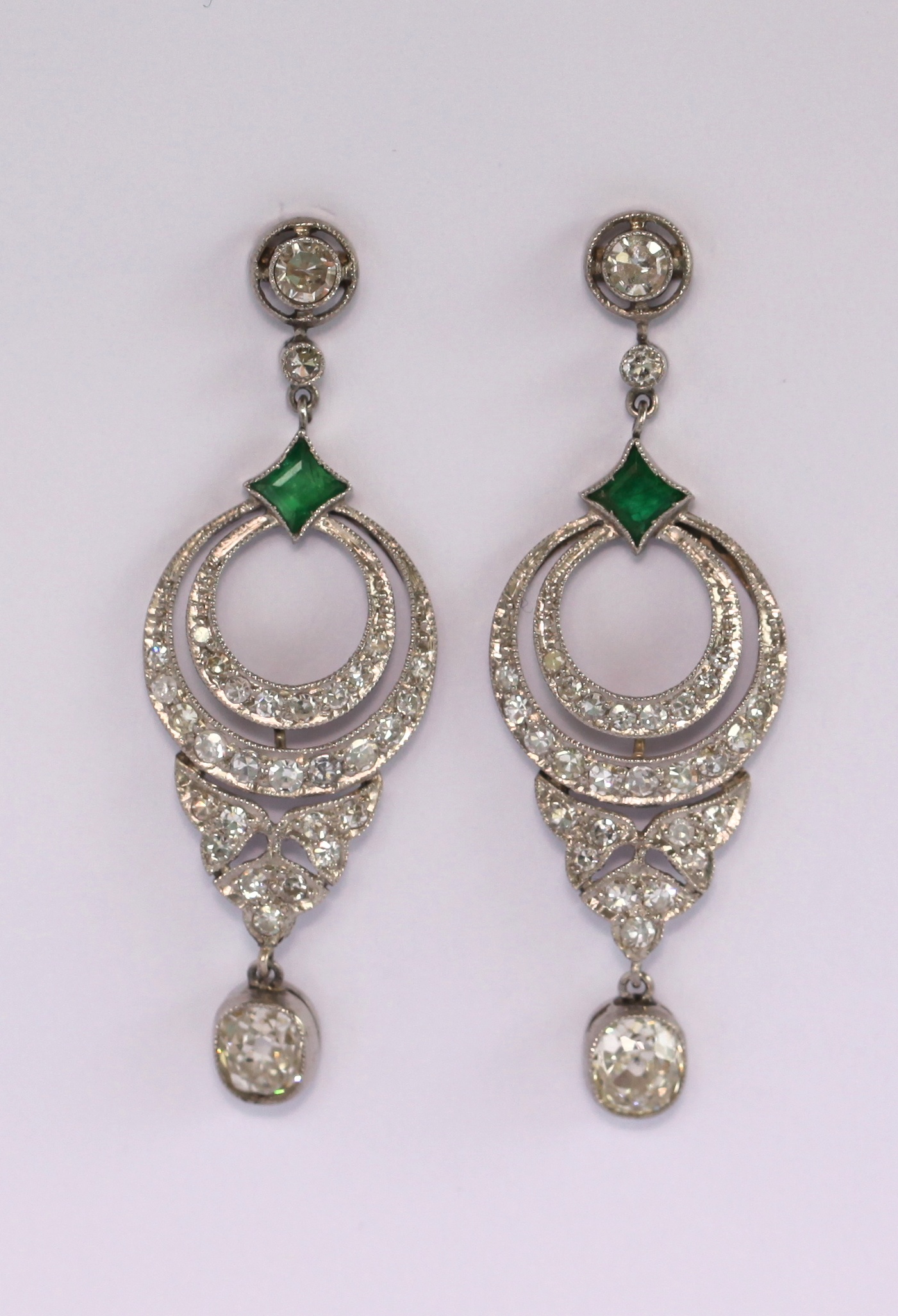 each composed of a millegrain collet set single cut diamond, within an open circular border, surmounting a smaller similar diamond atop an off-set shaped square cut emerald, suspending two graduated closed crescent borders, set with graduated single cut diamonds above a similarly set floral motif, with millegrain collet set oval cut diamond drop, with post and butterfly fittings