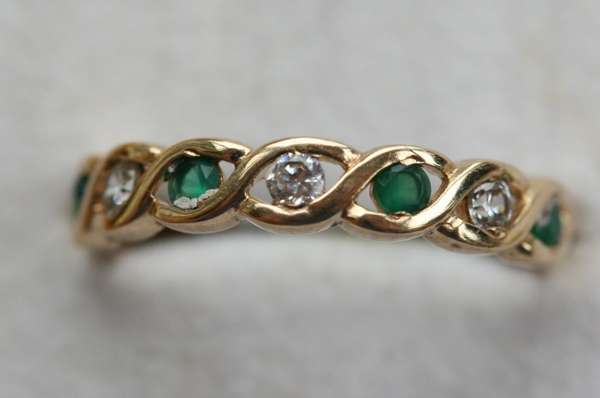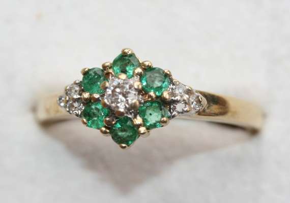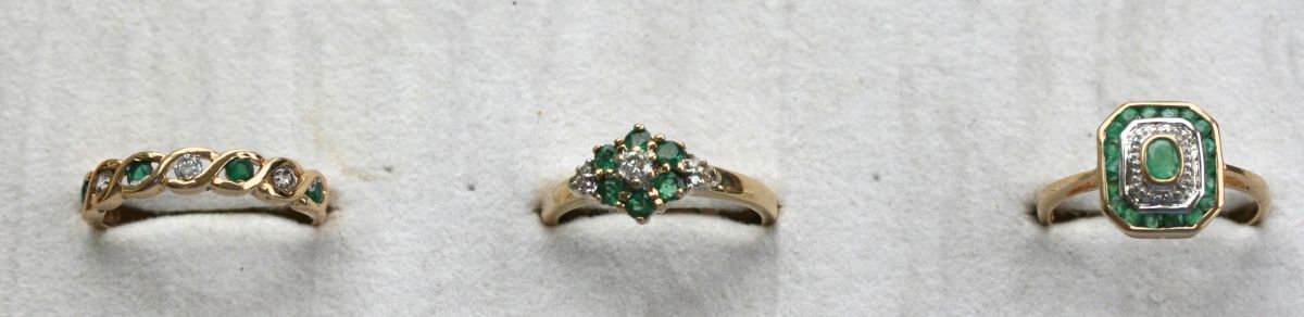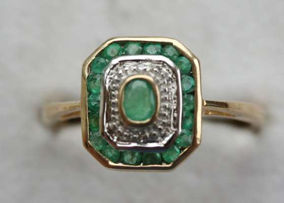 the first of art deco style, rectangular setting with central oval collet set emerald and diamond set inner border with outer border of circular cut emeralds, a diamond and emerald plain cluster ring, a half hoop eternity ring set alternating emeralds and diamonds, all set in gold