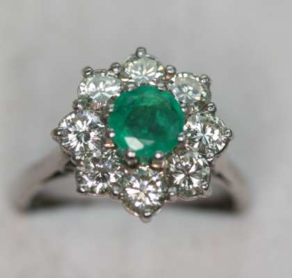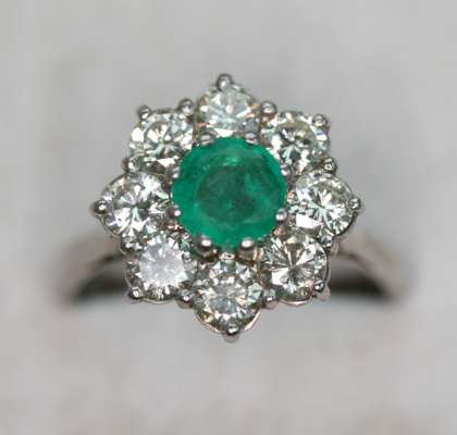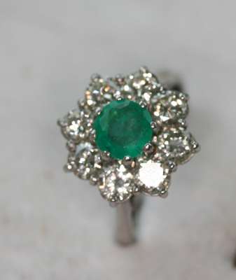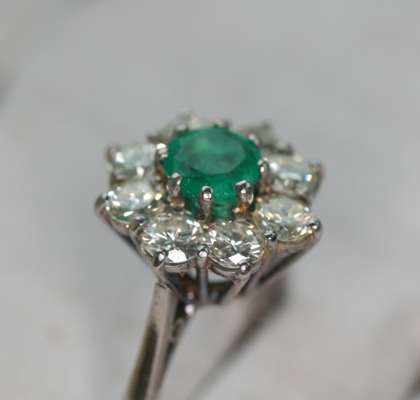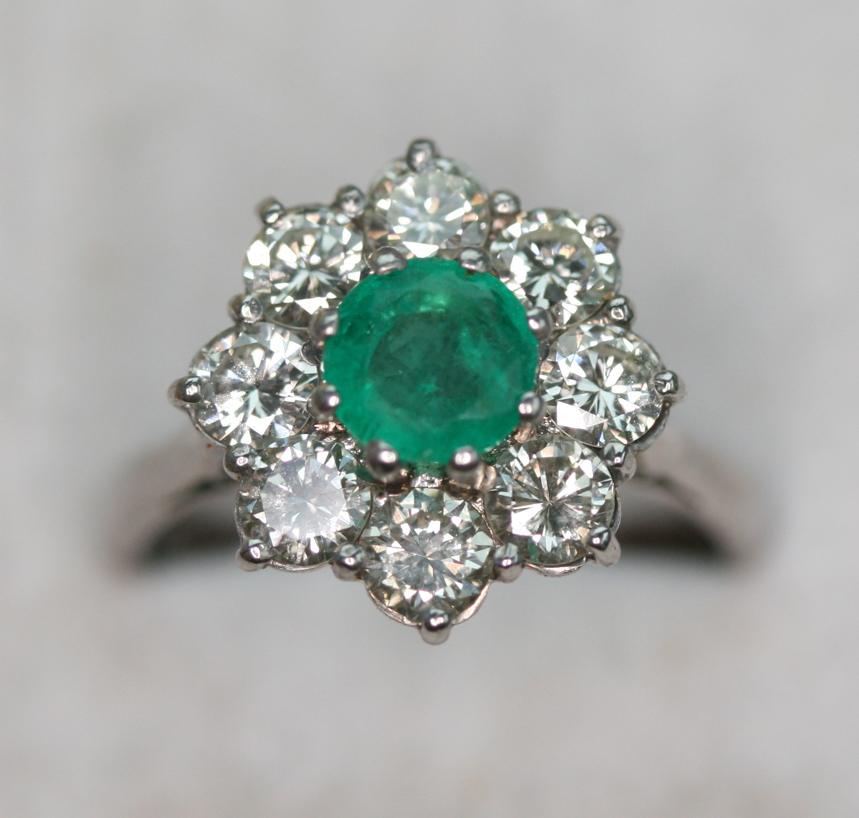 The circular emerald with a border of eight circular brilliant cut diamonds, set in 18ct white gold crown setting