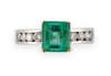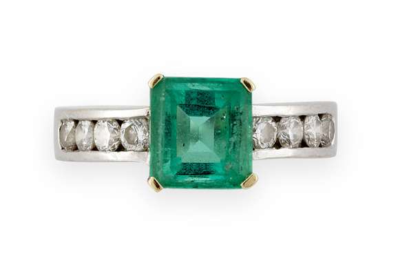 claw set to the centre with a square cut emerald, flanked to each shoulder by four channel set round brilliant cut diamonds