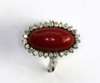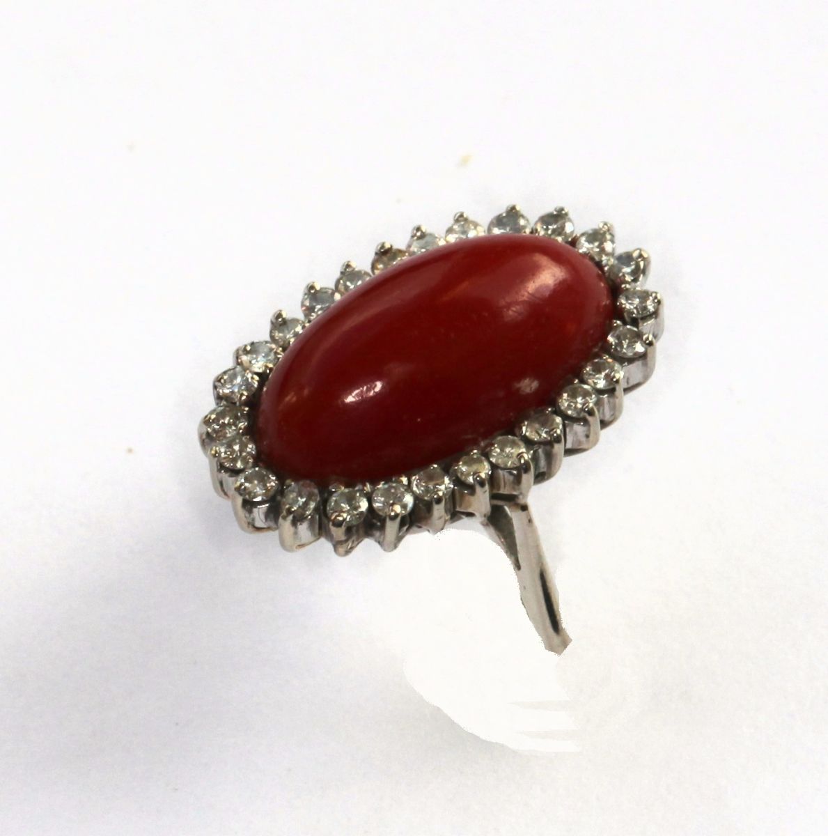 the principal coral of oval shape surrounded by a layer of small brilliant cut diamonds claw set on a slightly raised gallery atop a plain white metal shank
