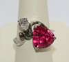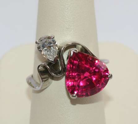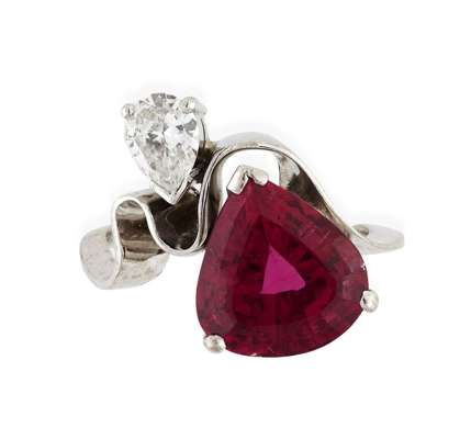 the front of asymmetric scroll design, corner claw set with a large rounded triangular cut rubellite and a pear cut diamond