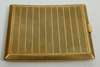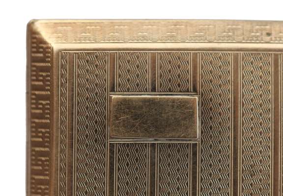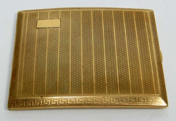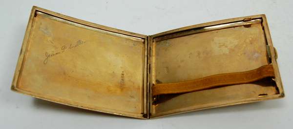 of slim curved rectangular form, with bevelled edge, engine turned throughout, inscribed to inside JEAN P MILLER in script