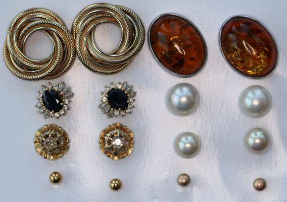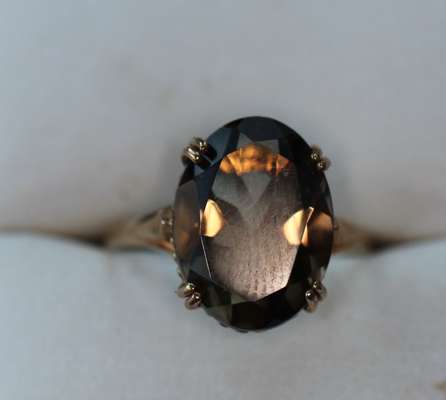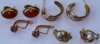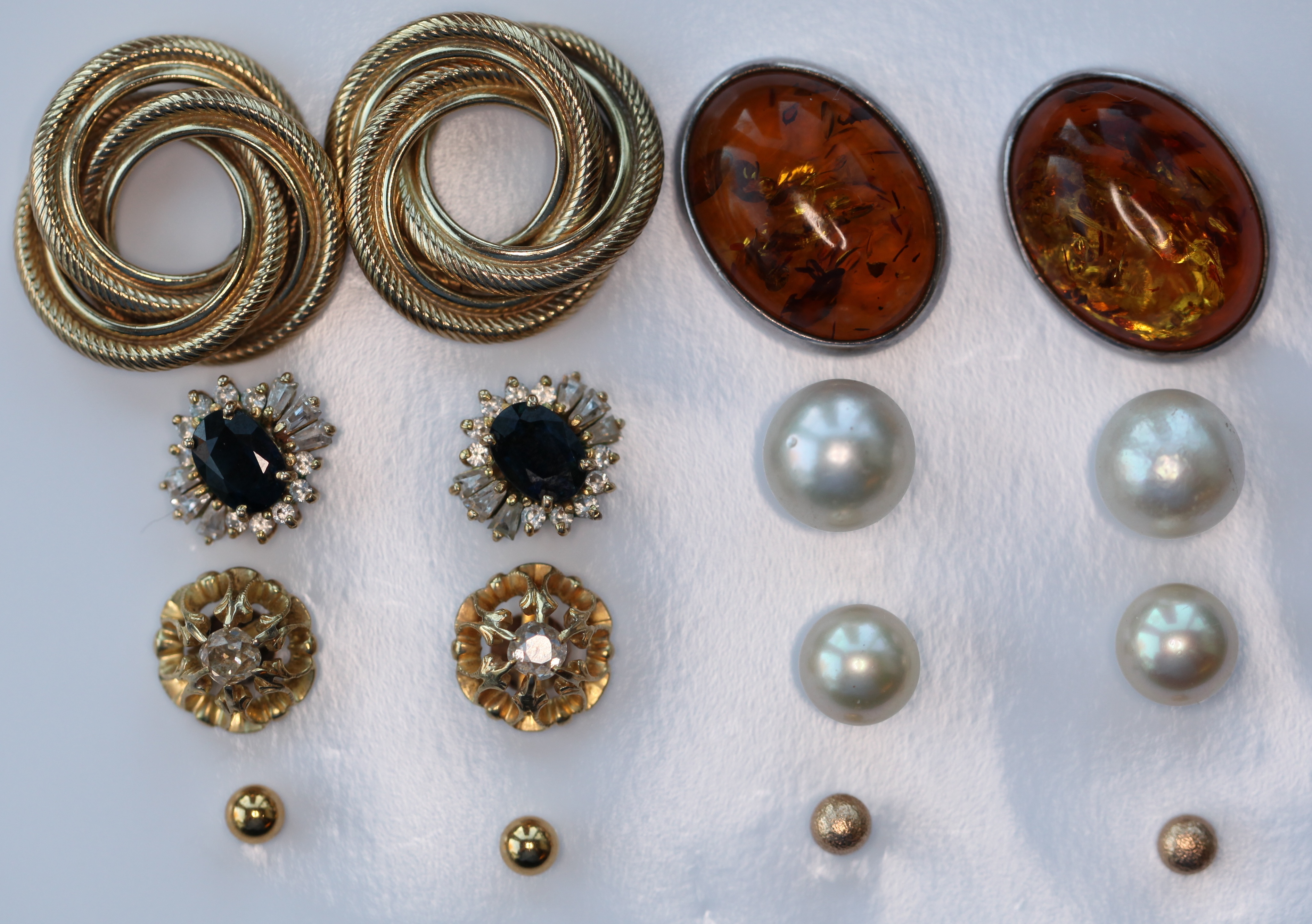mostly gold, some set with pearls, amber, amethysts, gem stones and shaped designs, together with a smoky quartz dress ring, a loose large smoky quartz of emerald cut, a pair of diamond earstuds claw set small old mine cut diamonds