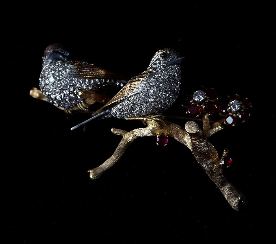 naturalistically designed as two birds resting on a flowering branch, the birds each with circular cut cabochon set eyes, and round brilliant cut diamond highlighted chest, the branch with floral clusters each claw set to the centre with a round brilliant cut diamond within a surround of similarly cut rubies, contained in a tooled pink leather fitted case stamped COLLINGWOOD OF CONDUIT ST., LTD...