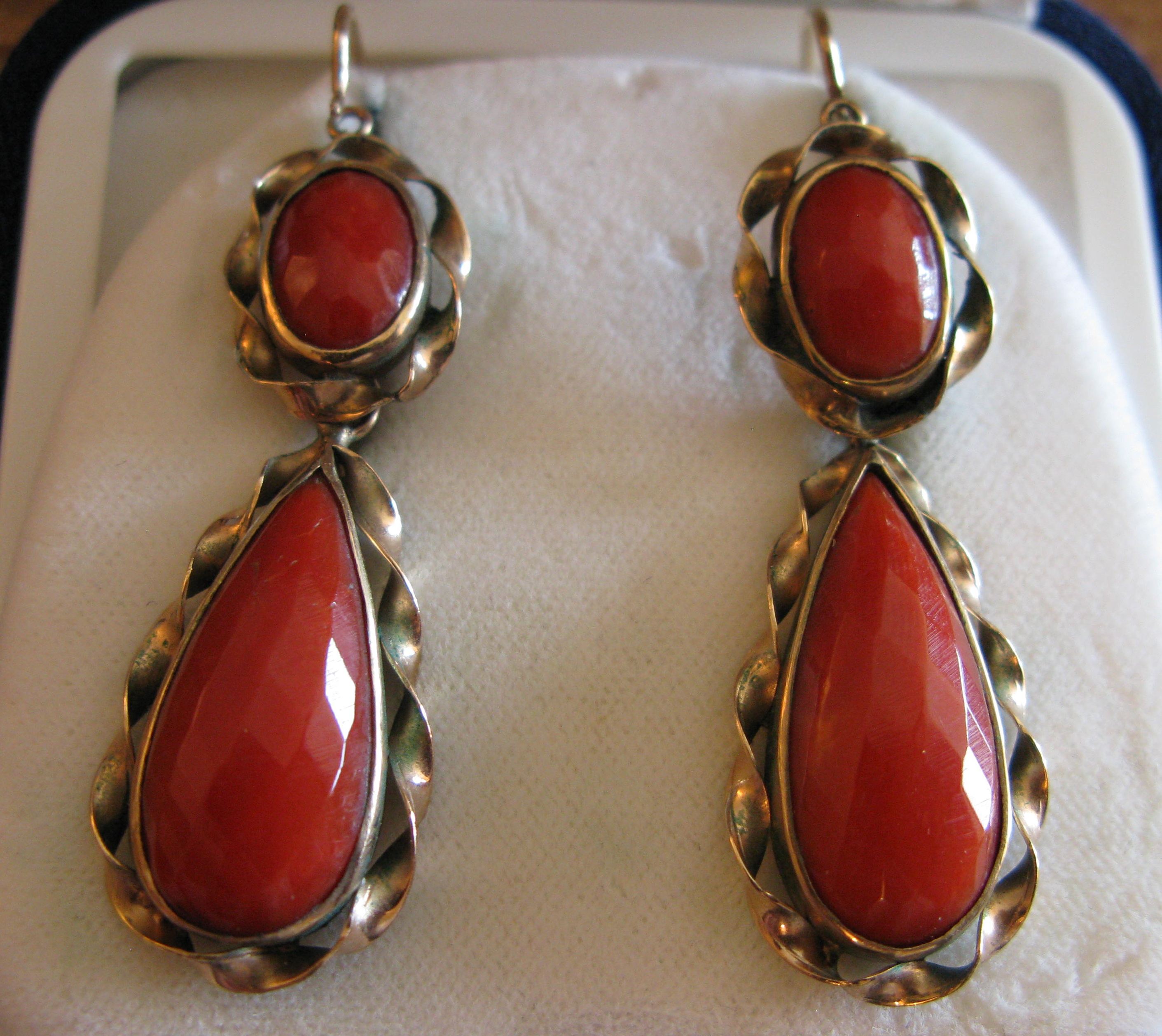 the drop shaped coral suspended below a smaller oval example, both set in a yellow metal frame of twisted design, with wire fittings