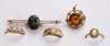 claw set with three oval opals, pairs of old European cut diamonds spaced between, to an 18ct gold shank; together with a similar opal and diamond set ring; an opal set ring; a citrine and seed pearl set pendant; and opal set yellow metal bar brooch (5)