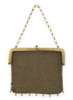 unmarked (tests as gold), with simple hinged cantle with amethyst push button thumb piece, with oval link chain and fine mesh link bag