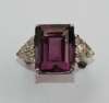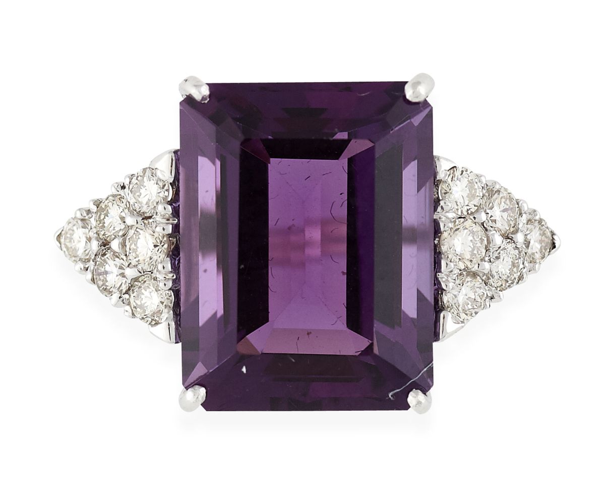 the central corner claw set trap cut amethyst flanked to either side by a triangular cluster set with six round brilliant cut diamonds