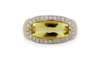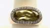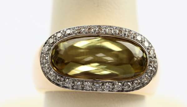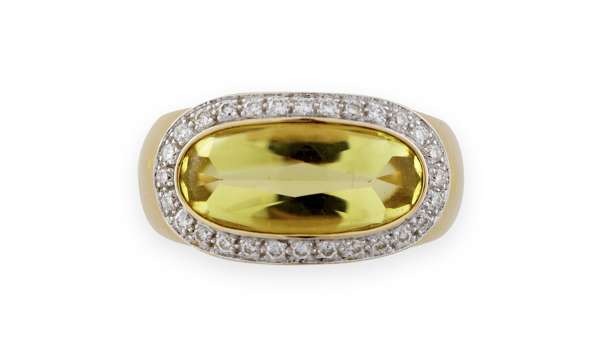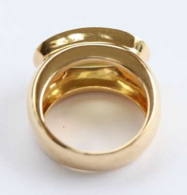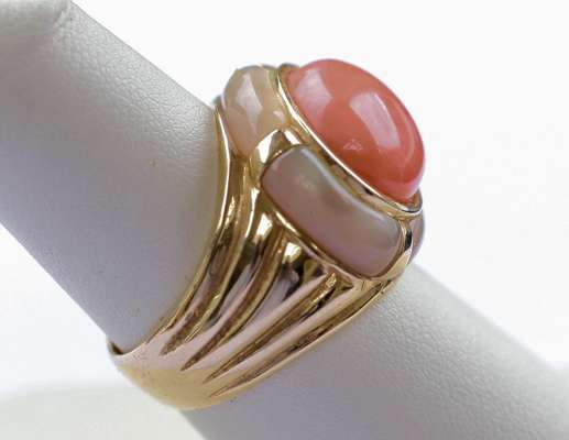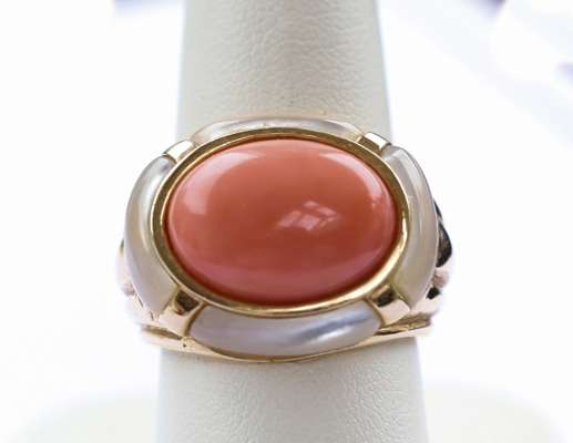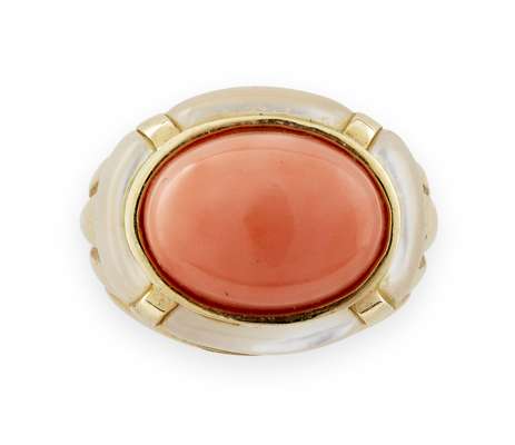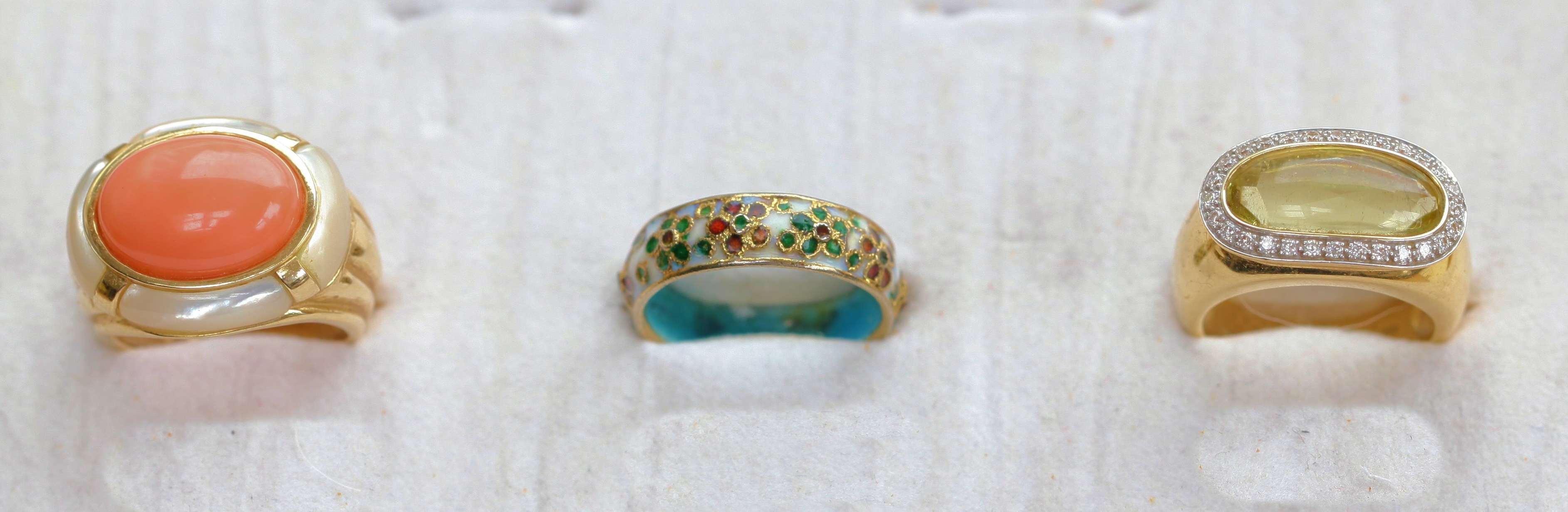 a 14ct gold ring set with an oval coral cabochon in a collet setting with a mother of pearl border, and enamel yellow metal ring with enamel decoration, an 18ct gold ring set elongated oval citrine cabochon with a pave set border of diamonds (3)