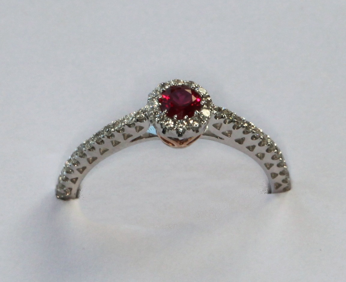 claw set to the centre with a circular cut ruby within a border of round brilliant cut diamonds, additionally set to each shoulder with twelve similarly cut diamonds, two-coloured shank stamped K18 R0.22 D0.23