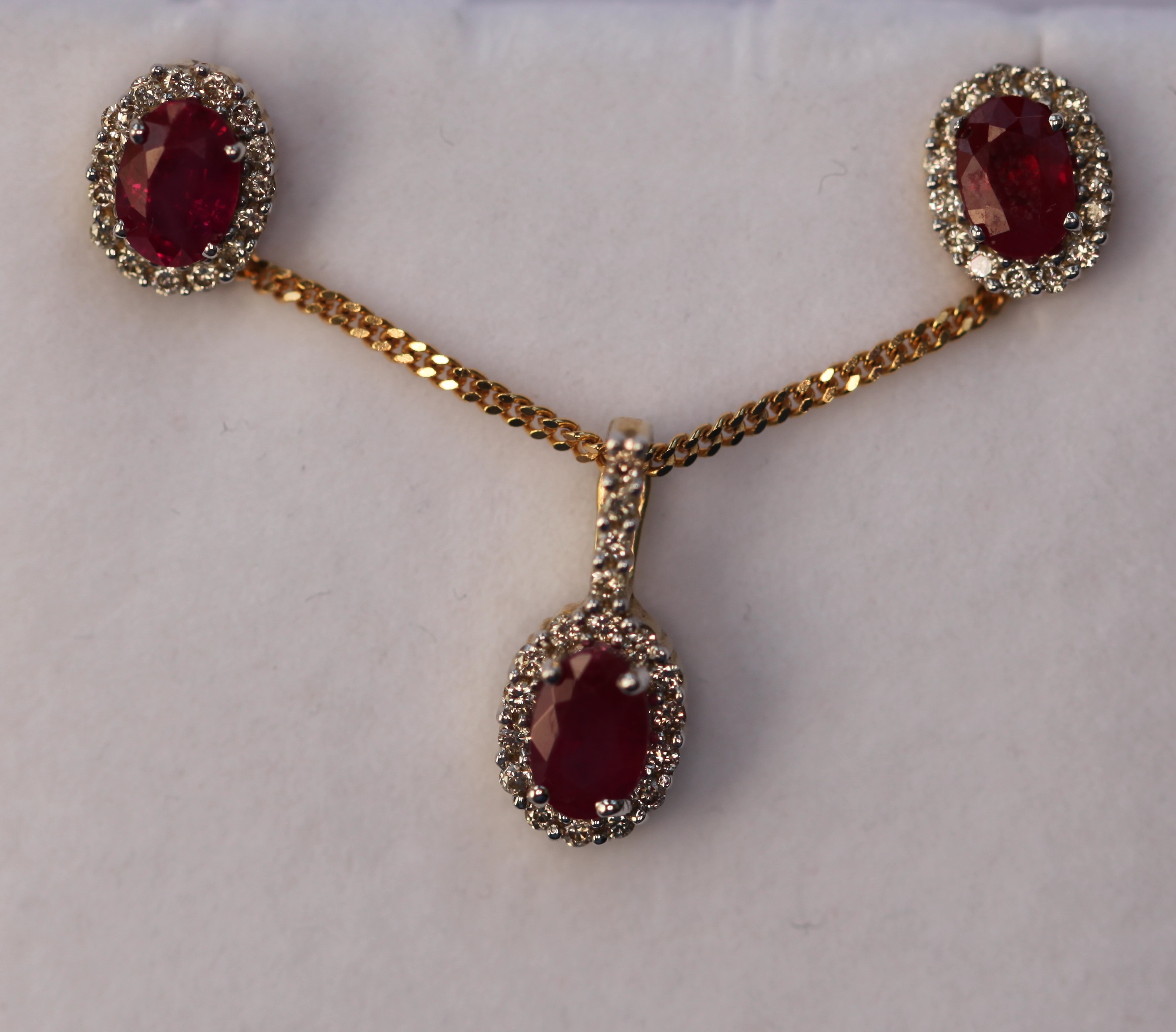 comprising a pendant with chain and a pair of matching earrings, each claw set with an oval cut ruby within a border of round brilliant cut diamonds, the pendant with similarly cut diamond set bale, suspended from a fine flattened curb link chain
