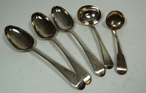 to include a set of six table spoons, A Orlie, Edinburgh 1782, of Old English pattern with feathered edge and engraved crest; a pair of Fiddle pattern toddy ladles, Edinburgh 1824; a matched set of six Scottish Fiddle pattern teaspoons, various makers; and a small group of Old English pattern flatware (qty)