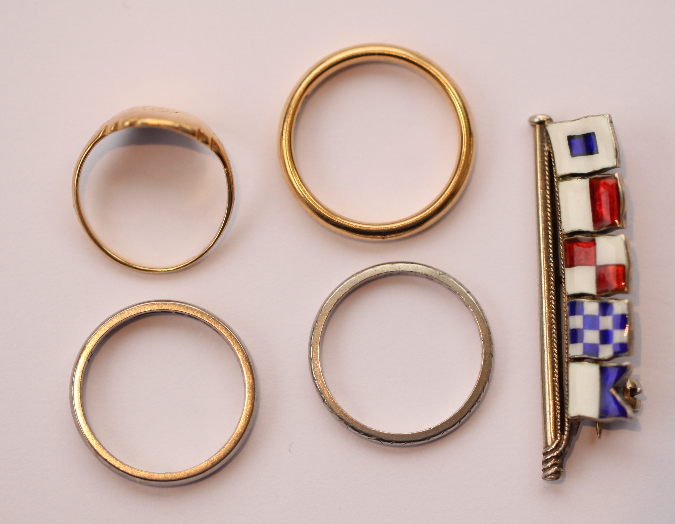 an 18ct white gold wedding band, engraved inscription; two other wedding bands and a small signet ring; together with a silver and enamel brooch, modelled as a flag pole with Naval signal in flags (ICS) reading 'SHUNA' (qty)