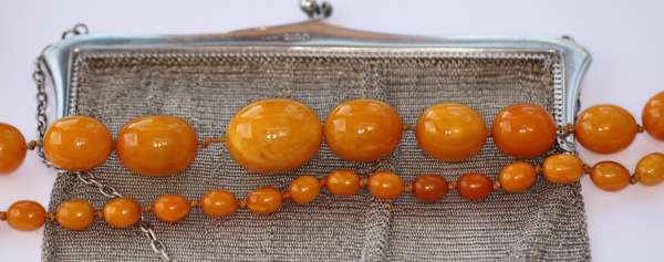 the cloudy amber bead necklace composed of graduated oval beads; the woven mesh link purse with shaped rectangular cantle hallmarked for London 1924-25, with belcher link suspension chain (2)