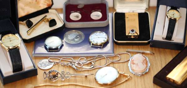 combined with four silver boxes, swizel stick and propelling pencils, silver Concord cufflinks, two watches, a gem set ring, hardstone goodluck charms, lighters coins, pins, two modern watches, a small group of gold and yellow metal items, three pairs of cufflinks, masonic fob, watch chain, chains etc. etc