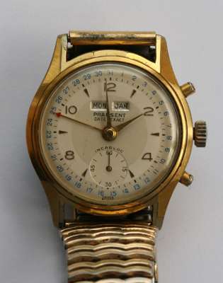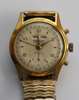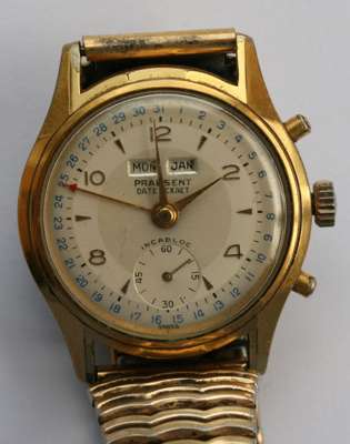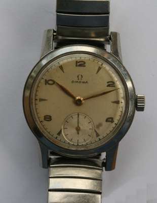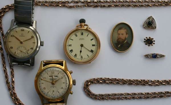 18ct gold open faced case, keyless wind, engraved outer cover and inner cover, dial inscribed Edward Glasgow, with a long gold fancy link muff chain; a small framed watercolour miniature of a hirsute gentleman; a sapphire and diamond set tie pin head and another enamelled and a paste sapphire and diamond bar, CHARLES GIGANDET PRAESENT DATE-EXACT gentlemans wrist watch, champagne dial, day and month aperture, date indicator sweep hand, subsidiary seconds dial, gilt case, OMEGA, a gentlemans wrist watch, dial with subsidiary seconds dial, both with later expanding bracelets