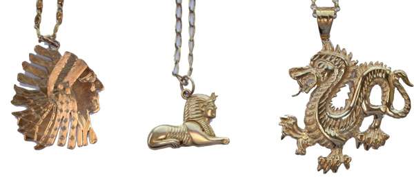 to include; an American Indian head pendant with a fancy chain marked 14k; a sphinx pendant with a chain marked 375; a dragon pendant, bale hallmarked 9ct gold and on a chain marked 375 (qty)