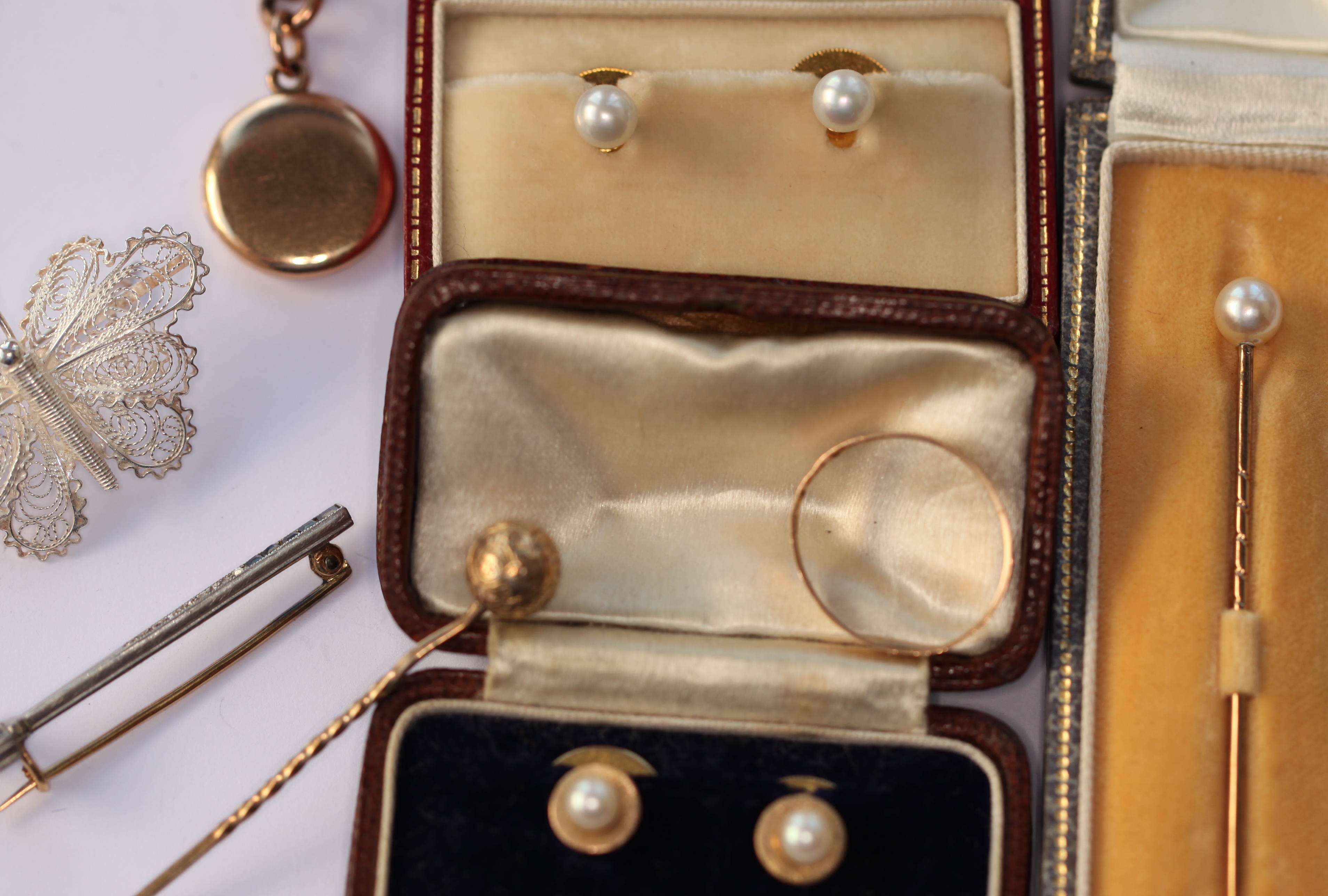 a gold ball tie pin, wedding band, small gold locket, pearl tie pin and studs, filigree silver brooch and an attractive art deco sapphire and diamond brooch modelled as a croquet mallet indistinctly marked (qty)