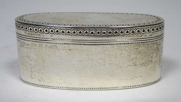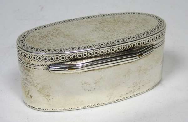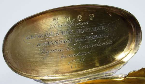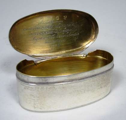 Patrick Robertson, Edinburgh 1775, of straight sided oval outline with hinged cover with ring and dot border, the gilt interior with latin presentation inscription inside of lid