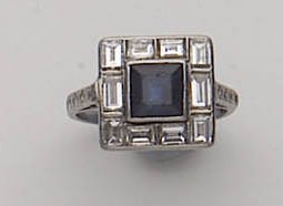 with square cut sapphire in centre, surrounded by ten baguette diamonds. Approximate weight of sapphire: 1 carat