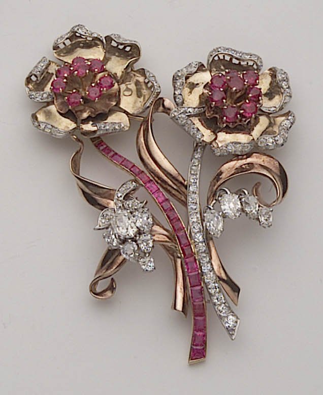 A Ruby and Diamond double flower motif brooch, from the 1950's