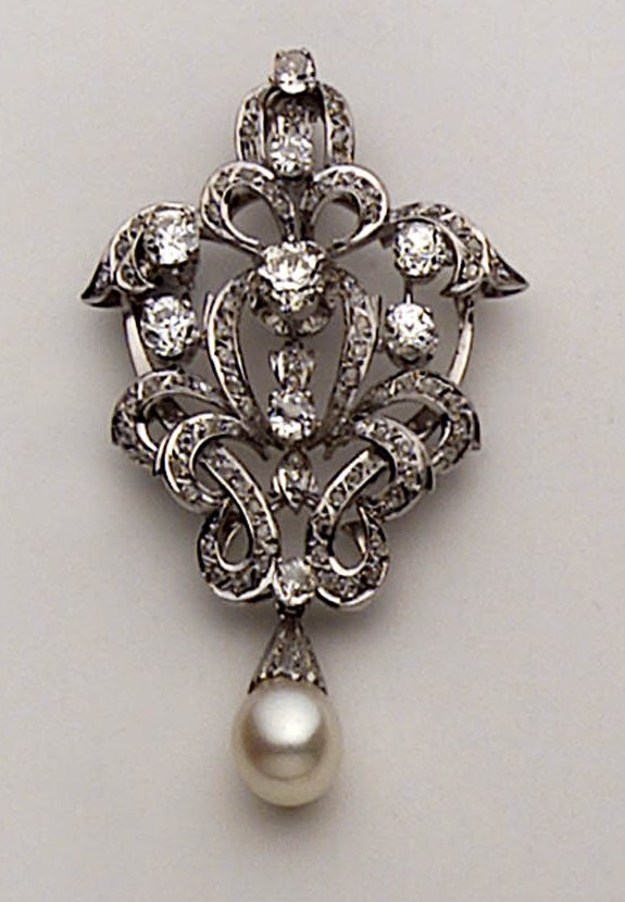 of intricate overlapping scroll design with pendant pearl. With two white trace chains of 16" and 18" lengths.