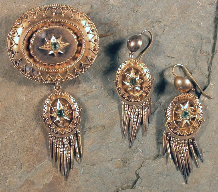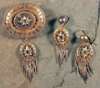 of oval form with cannatille work and central peridot with smaller oval suspension similarly set with graduated tassels and a pair of earrings to match